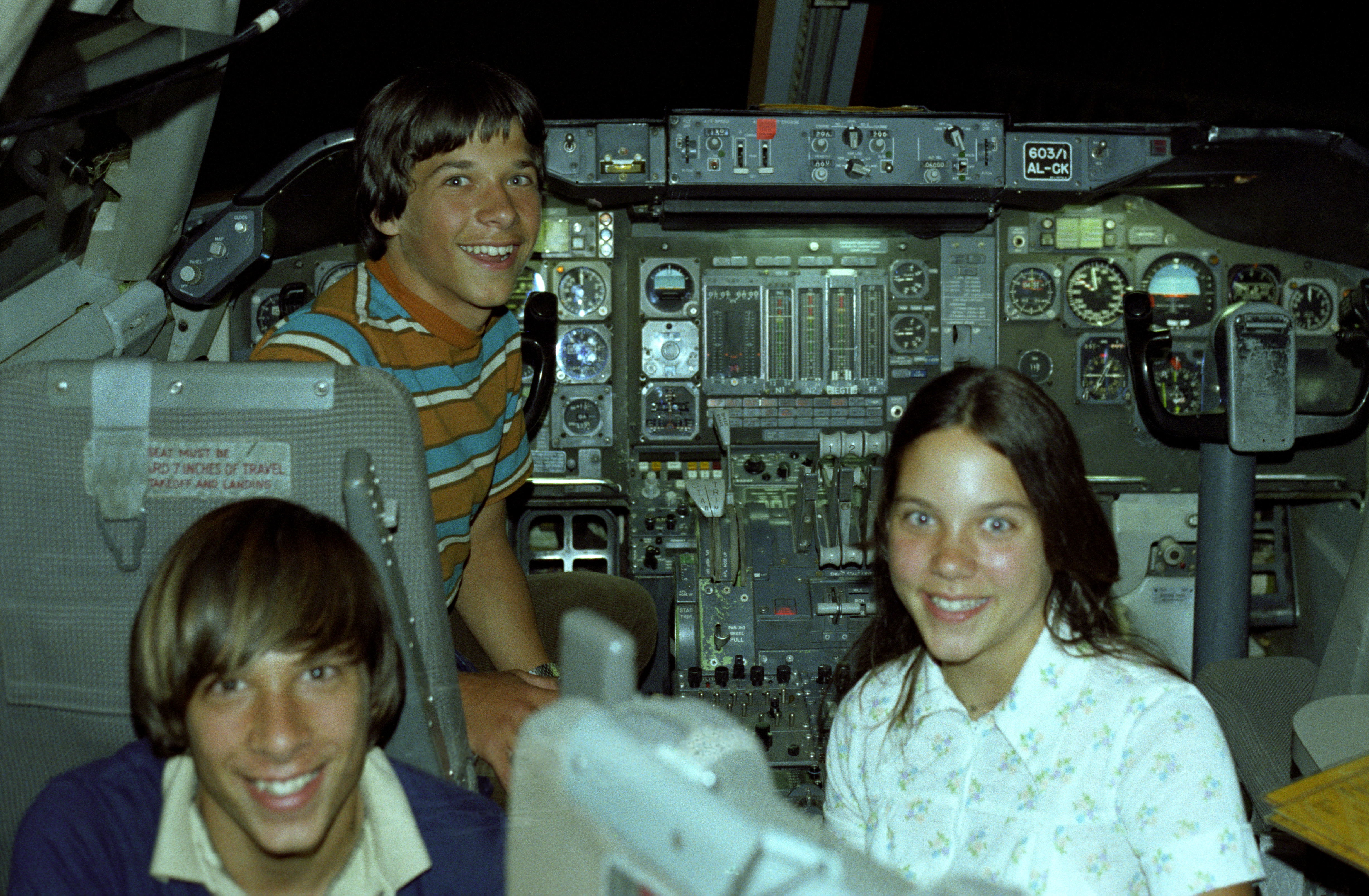 Dave, Tom, and Pam occupy the cockpit of a jumbo jet at the