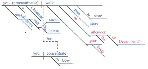 | Every year on the afternoon of December 24, you, a Christmas procrastinator, loaded down with sacks and boxes, walk from store to store, down endless aisles, your eyes scanning windows and racks to find the perfect presents for Mom, Grandpa, and Uncle Joe, but since you know in your heart of hearts that Uncle Joe will appreciate nothing you give him and that you will capitulate to necessity and buy Grandpa a fifth of Seagram’s, you concentrate on Mom, as you move into the aisle that you hope to be able to call the final stop of this holiday season. |