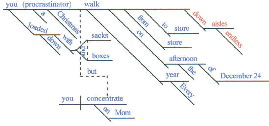 | Every year on the afternoon of December 24, you, a Christmas procrastinator, loaded down with sacks and boxes, walk from store to store, down endless aisles, your eyes scanning windows and racks to find the perfect presents for Mom, Grandpa, and Uncle Joe, but since you know in your heart of hearts that Uncle Joe will appreciate nothing you give him and that you will capitulate to necessity and buy Grandpa a fifth of Seagram’s, you concentrate on Mom, as you move into the aisle that you hope to be able to call the final stop of this holiday season. |