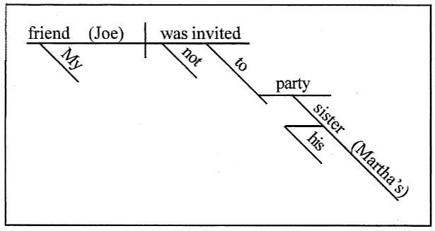 | On the right is a diagram of the sentence "My friend Joe was not invited to his sister Martha's party." The noun Joe is in apposition with the noun friend; Joe is a restrictive appositive. The possessive noun Martha's is in apposition with the possessive noun sister.* My and his are possessive pronouns. | ![]() |
