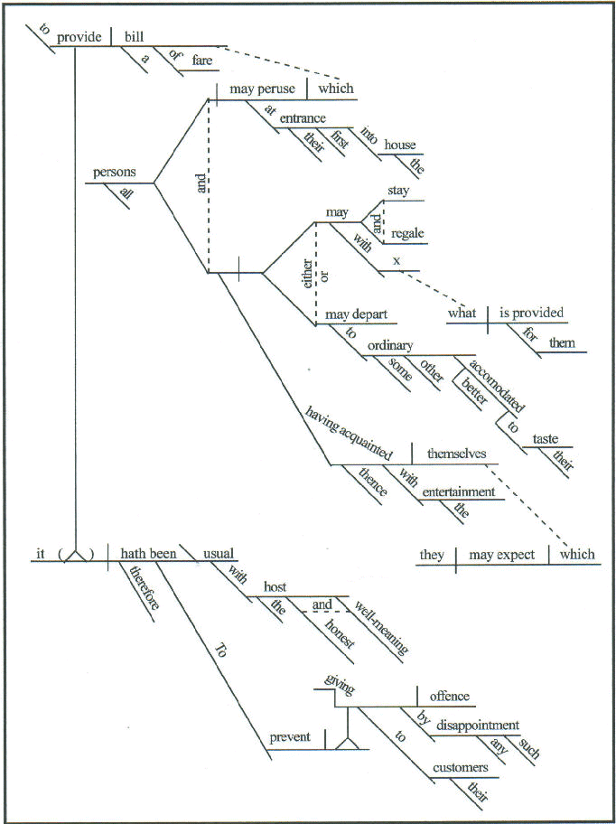 Sentence 5: "To prevent, therefore, giving offence to their customers by any such disappointment, it hath been usual with the honest and well-meaning host to provide a bill of fare which all persons may peruse at their first entrance into the house; and having thence acquainted themselves with the entertainment which they may expect, may either stay and regale with what is provided for them, or may depart to some other ordinary better accommodated to their taste." --Tom Jones, by Henry Fielding (from the second paragraph) |