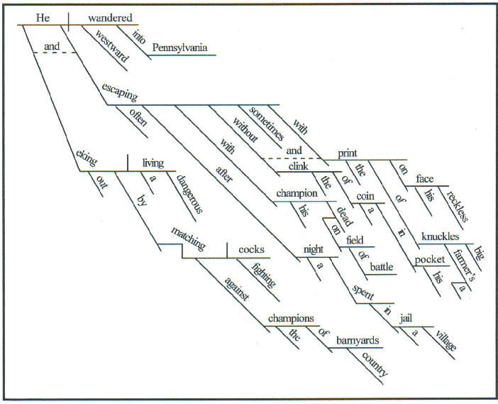 Sentence 6: "He wandered westward into Pennsylvania, eking out a dangerous living by matching fighting cocks against the champions of country barnyards, and often escaping after a night spent in a village jail, with his champion dead on the field of battle, without the clink of a coin in his pocket, and sometimes with the print of a farmer's big knuckles on his reckless face." --Look Homeward, Angel! by Thomas Wolfe (first page) |