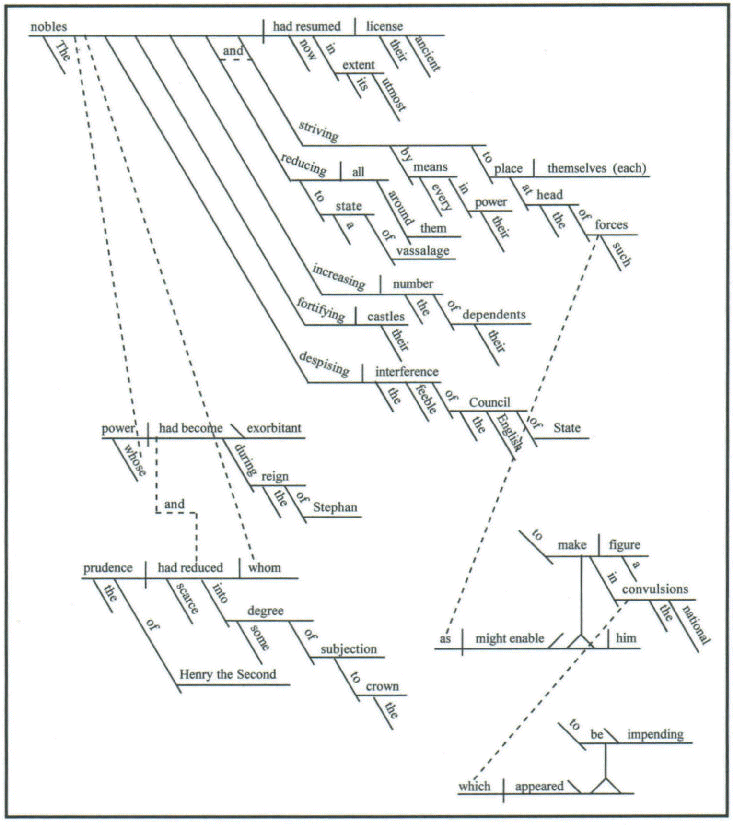 Sentence 8: "The nobles, whose power had become exorbitant during the reign of Stephan, and whom the prudence of Henry the Second had scarce reduced into some degree of subjection to the crown, had now resumed their ancient license in its utmost extent; despising the feeble interference of the English Council of State, fortifying their castles, increasing the number of their dependents, reducing all around them to a state of vassalage, and striving by every means in their power to place themselves each at the head of such forces as might enable him to make a figure in the national convulsions which appeared to be impending." - Sir Walter Scott, Ivanhoe, Chapter 1 (from the second paragraph) |