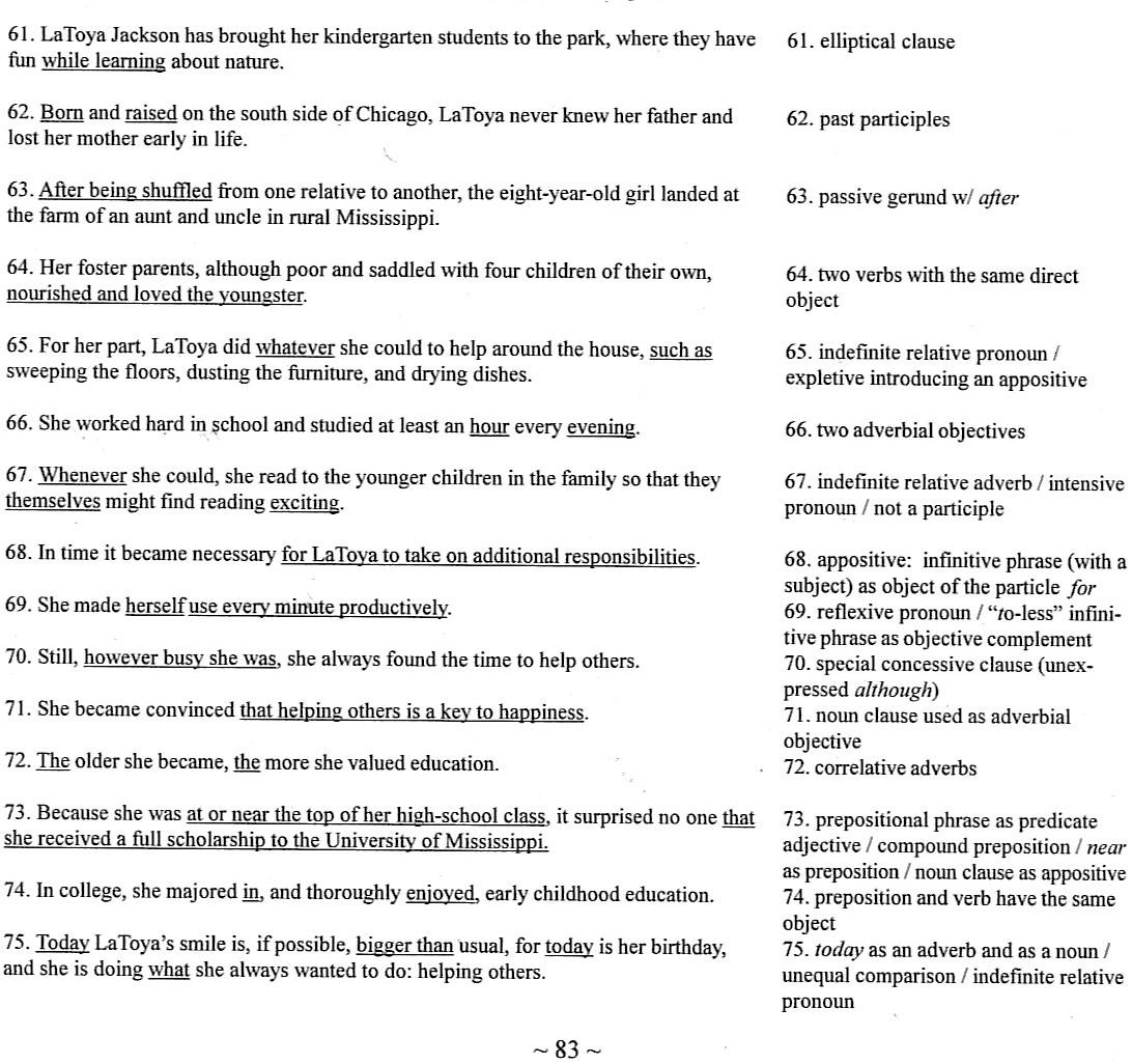 People in the Park: Story 4 Rodney and Jenny Long, who are jogging together around the lake, call the park their second home. Running relaxes them and helps them think clearly. About three months ago, their lives changed when the agency Rodney had been working for abruptly went out of business. He had just been appointed department head, but that was of little use now. Jenny had no choice but to take the first job she found even though she hated the job and would have preferred to continue staying home with the couple’s two small children. Rodney has been searching diligently for another job in his field; however, so far his efforts have brought him nothing but headaches. He has taken over the job of caring for the children. It has been hard to get interviews because good job openings are scarce. His letters have mostly gone unanswered, his calls unreturned. Some time back, he got a call requesting him to come for an interview. Sadly, the interview fizzled as did two or three others, and lately he has been offered no interviews at all. Setting out for the park this morning, both Jenny and Rodney were in a strange mood. It looked as if Rodney would have to broaden his job search to include other cities and even other states. As they jog around the lake, they agree on a new course for their lives: they will move to Oregon, a state they have both loved from a distance. The decision made, a pleasant excitement gently moves aside the anxious discontent of recent weeks. On a separate sheet of paper, diagram the sentences of Story 4. Grammar information about the underlined words is found on the right.