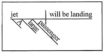 | On the right is a diagram of the sentence "A large passenger jet will be landing." The subject, jet, is modified by the indefinite article a, the adjective large, and the noun passenger, which functions here as an adjective. | ![]() |