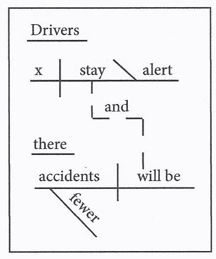 | On the right is a diagram of the sentence "Drivers, stay alert, and there will be fewer accidents." Drivers is a noun of direct address (a vocative). Stay is a liking verb, alert a predicate adjective. The coordinating conjunction and connects the two main clauses. There is an expletive. | ![]() |